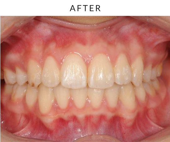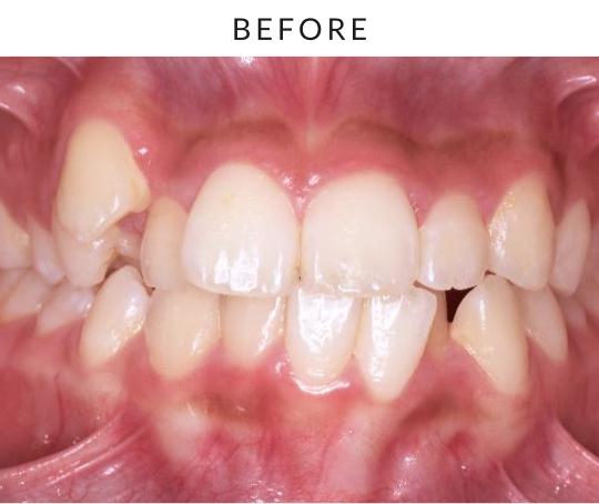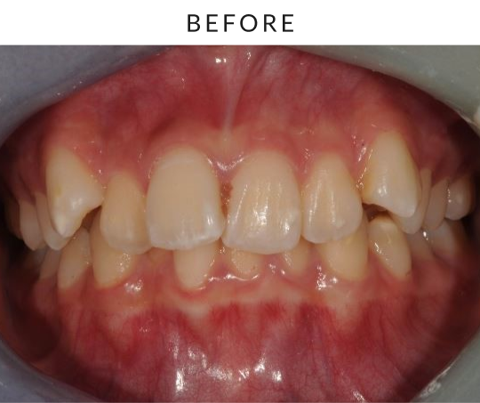 This patient had an open gap between the front teeth and a misaligned bite. Invisalign treatment was used to close the gap and guide the bite into a healthier, more stable position.