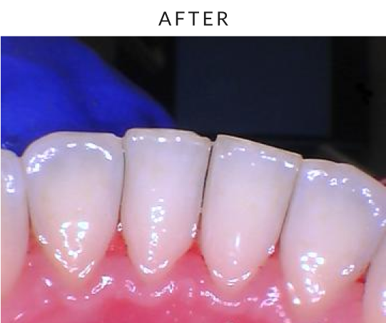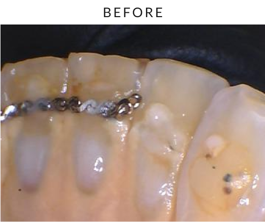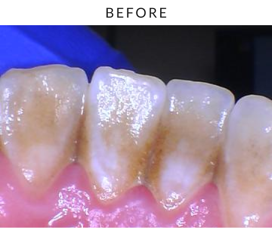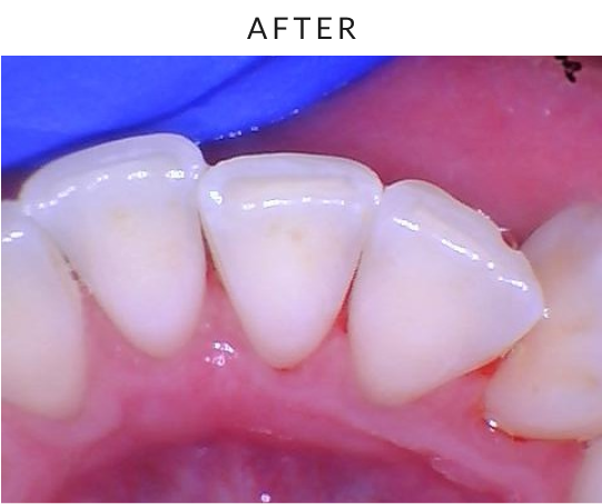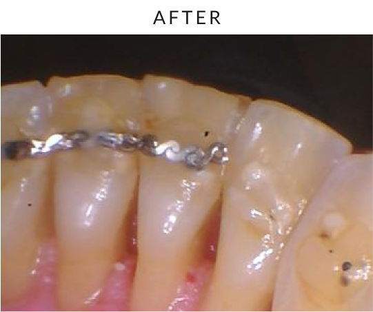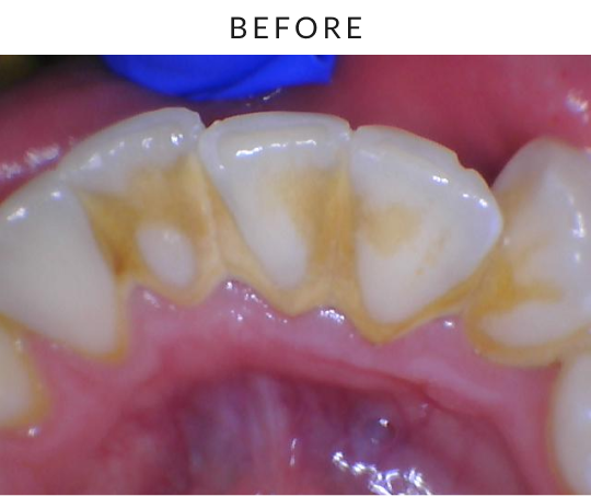 This patient had significant calculus buildup around a permanent lower retainer. We carefully removed the deposits to improve gum health and restore a cleaner appearance to the lower front teeth.