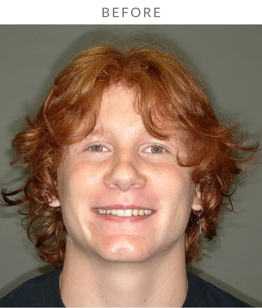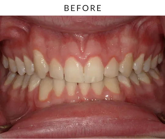 This patient presented with a Class II bite, deep overbite, and extruded canines. Invisalign was used to gradually align the teeth, correct the bite, and create a more even, natural-looking smile.